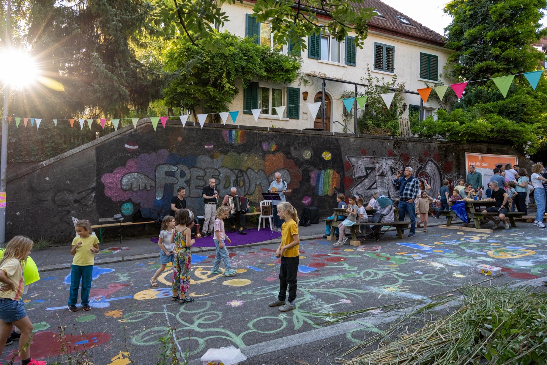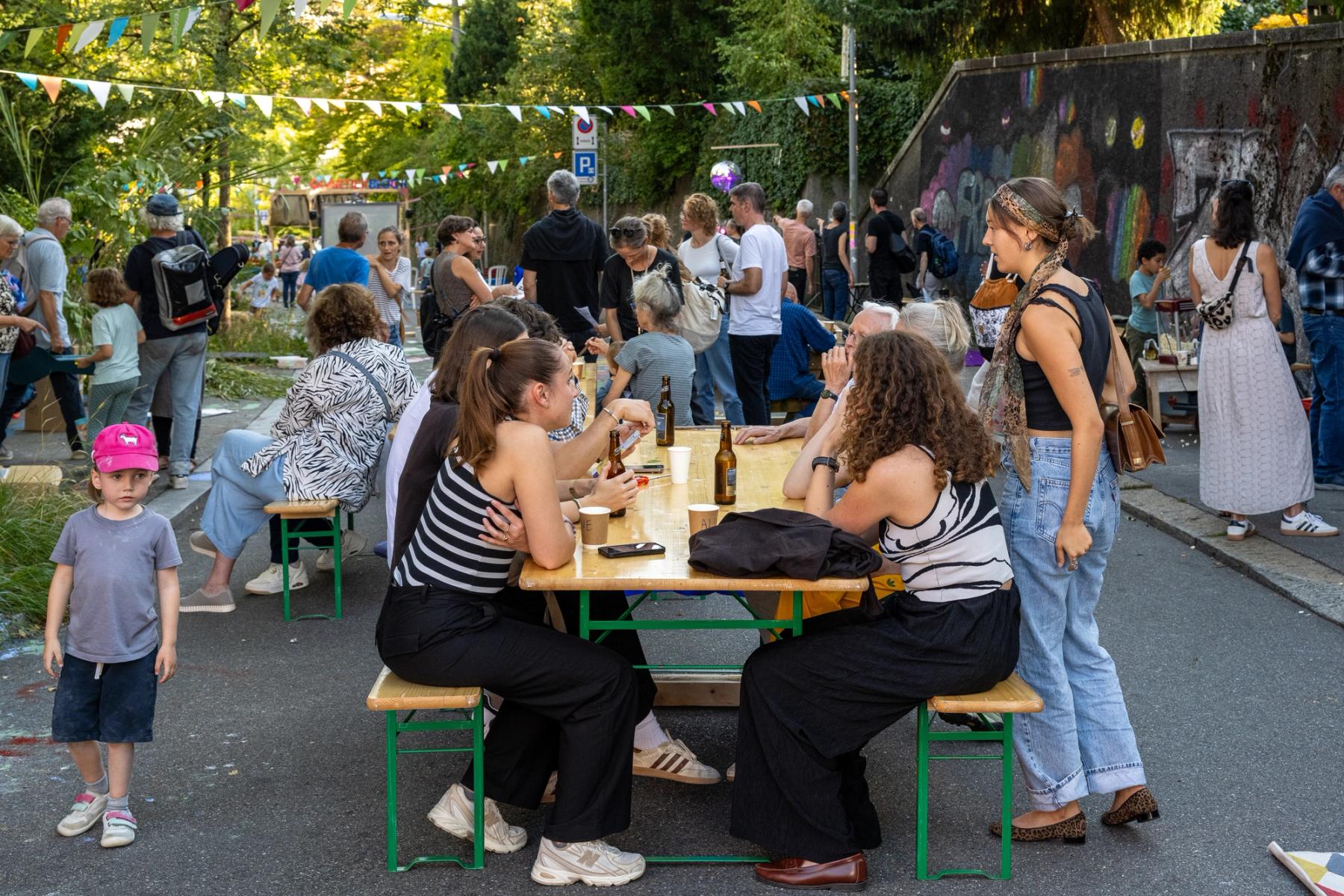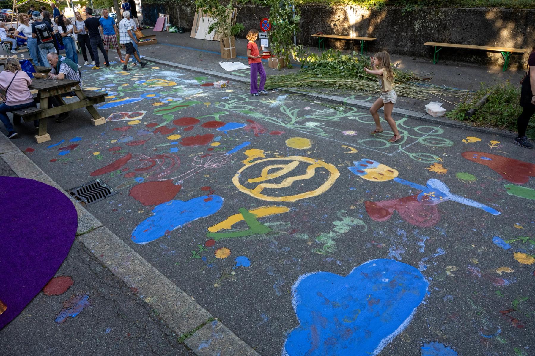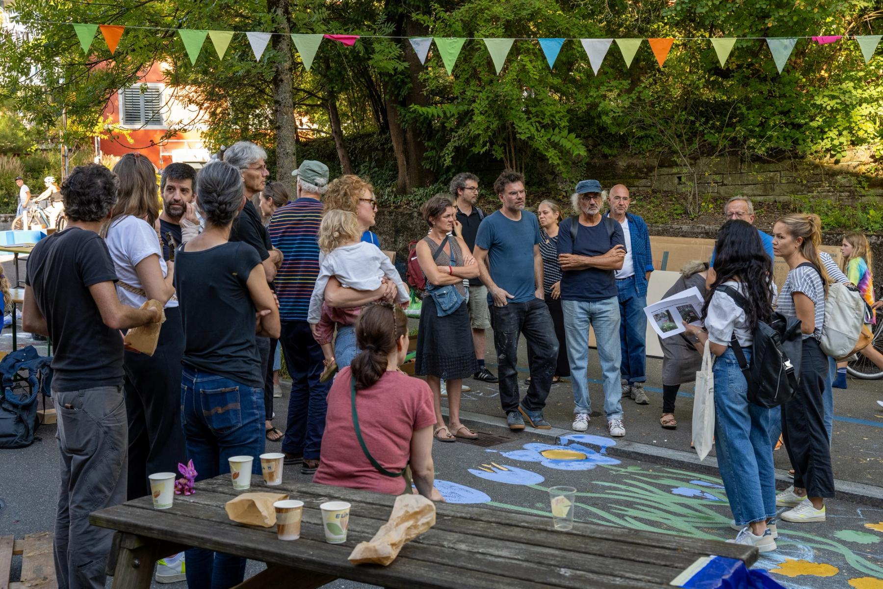 Wir sperren die Strasse und proben die Begrünung. Kommt und pinselt mit! Crêpes-Stand, Picknick-Buffet und Livemusik auf dem Strassenabschnitt, der in Zukunft im Rahmen des Quartierblocks gesperrt sein wird.