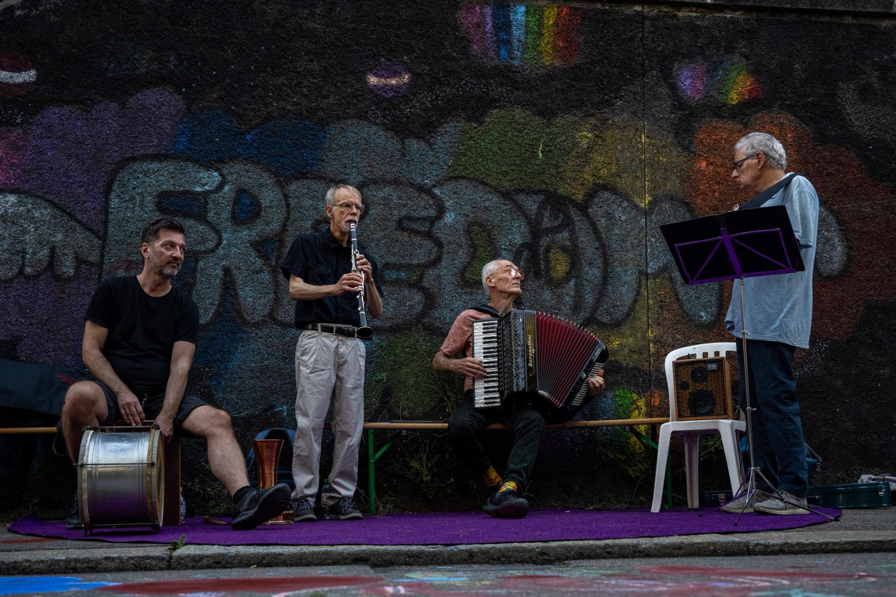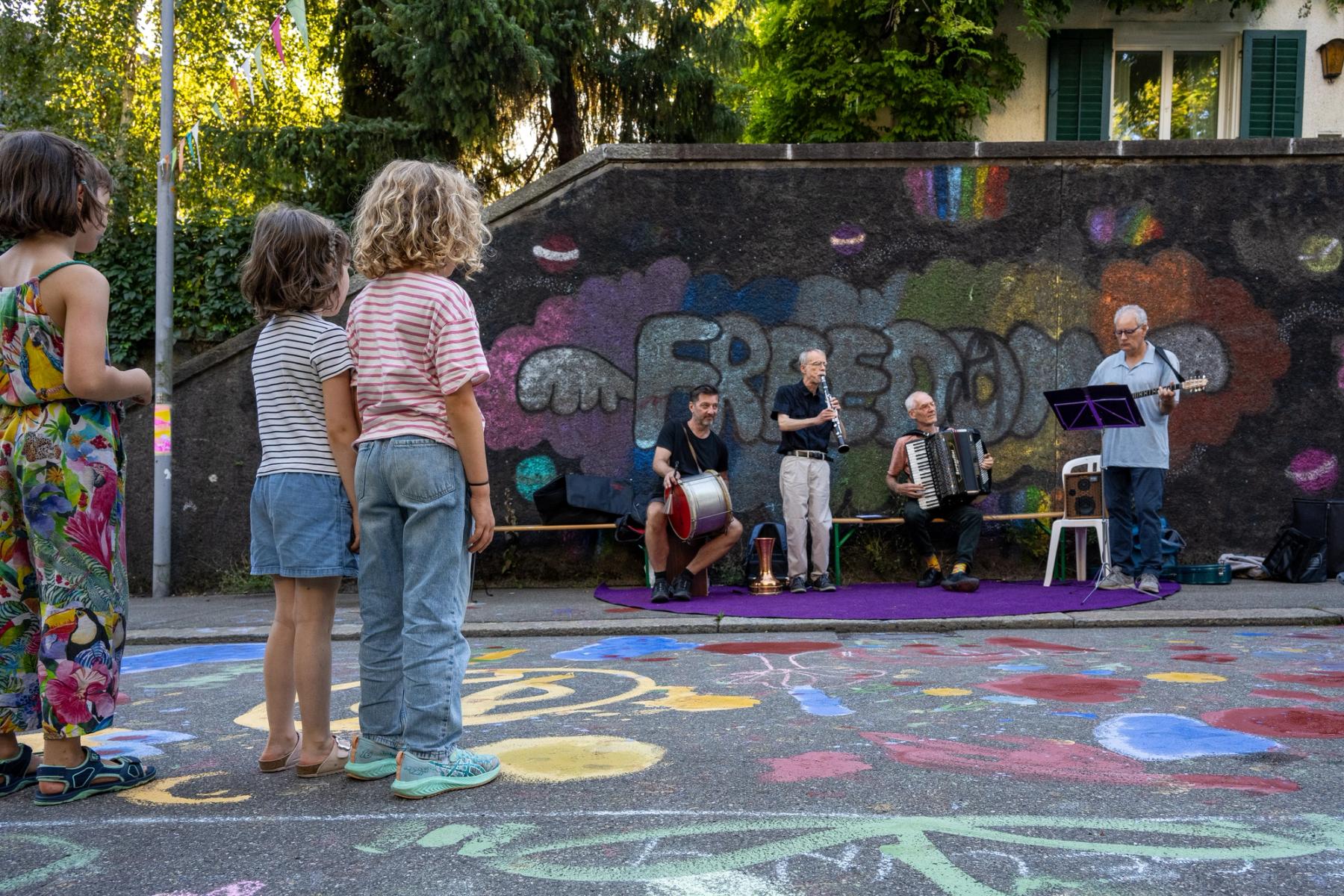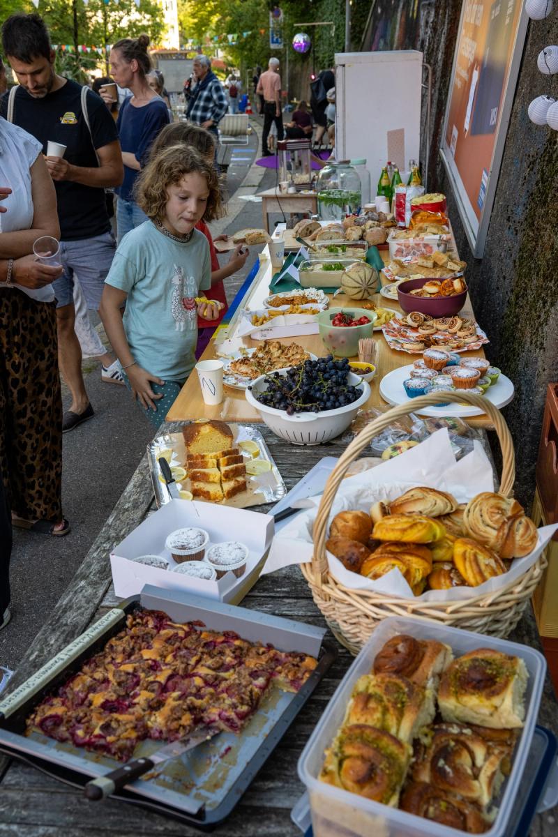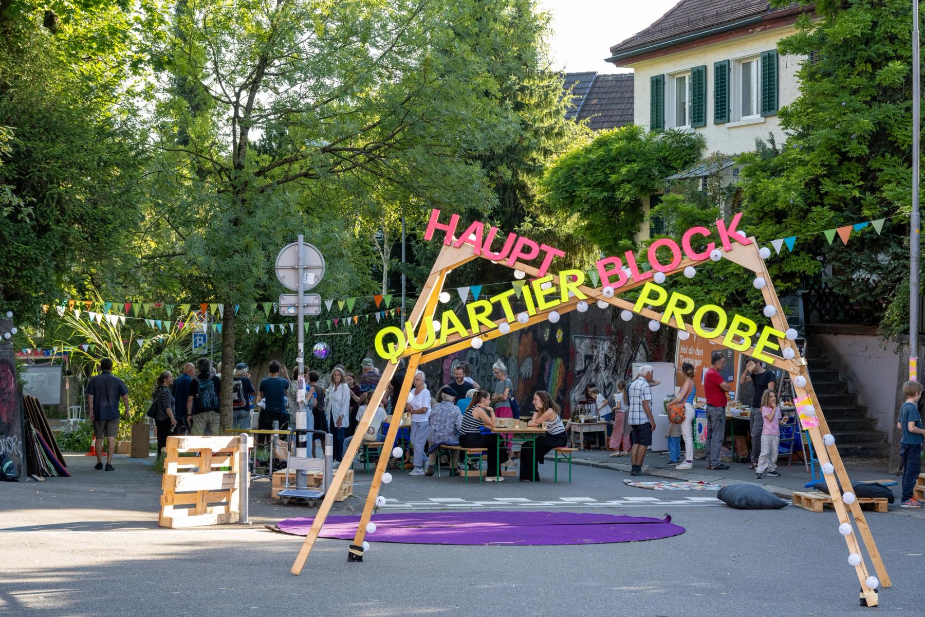 Wir sperren die Strasse und proben die Begrünung. Kommt und pinselt mit! Crêpes-Stand, Picknick-Buffet und Livemusik auf dem Strassenabschnitt, der in Zukunft im Rahmen des Quartierblocks gesperrt sein wird.