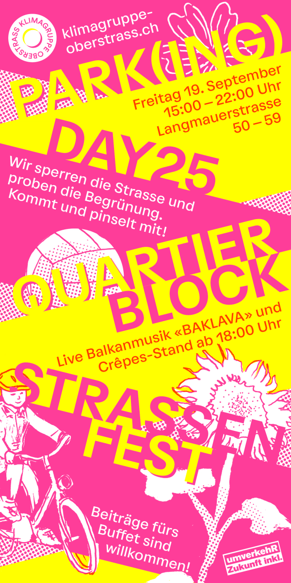 Wir nutzen den Anlass des PARK(ing)-Day und gehen einen Schritt weiter: Wir sperren die ganze Langmauerstrasse zwischen Scheuchzer- und Stüssistrasse für unser Fest. Dieser Strassenabschnitt soll im Rahmen der Umsetzung des Quartierblocks in Zukunft für den Autoverkehr gesperrt und grosszügig begrünt werden. Um dies bereits jetzt erlebbar zu machen, steht der diesjährige PARK(ing)-Day unter dem Motto: Quartierblock-Hauptprobe.